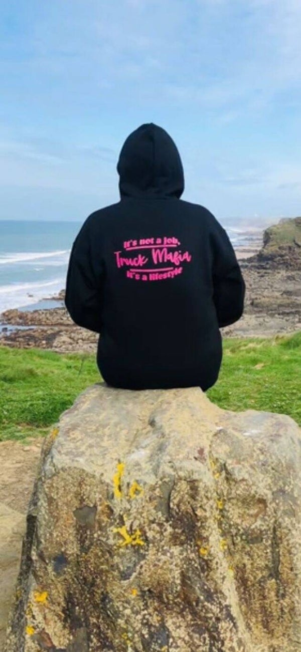 Adult's black hoodie with pink Truck Mafia logo on the back